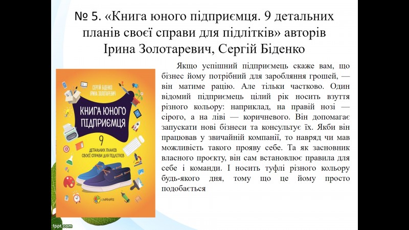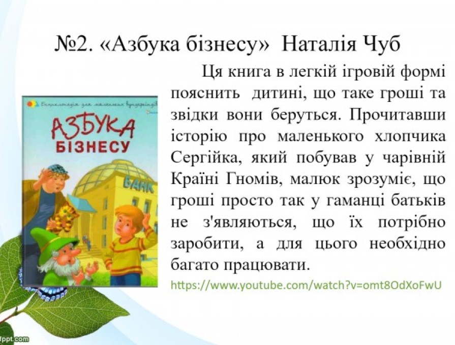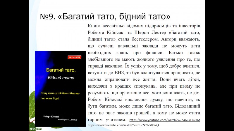 Читаючи книги, людина розширює свої знання чи то з художньої, чи наукової літератури, стає розумнішою і грамотнішою, з великим багажем слів . Але, на жаль, з появою інноваційних технологій людство замінило паперові книги на електронні, діти стали значно менше ходити в бібліотеки та замовляти книги для читання. Це є проблемою сьогодення. Тому батьки вдома, учителі в школах, вихователі в садочках повинні знаходити всілякі методи заохочення для того, щоб діти знову полюбили книги. Учні 8-х класів разом із учителем «Фінансової грамотності» в рамках проходження «Тижня фінансової грамотності та споживчих знань» переглянули презентацію про сучасні твори з економічним змістом. Це - «Копійчані мандри» О. Конечної, «Азбука бізнесу: пригоди Сергійка у Країні Гномів» Н.Чуб, «Як говорити з дітьми про гроші» Р.Лібер, «Книга юного підприємця» С.Біденко та І.Золотаревич, «Фінансова грамотність для малюків» А.Гресь, «Таємне життя грошей» К.Вермод, «Пес на ім’я Мані, або абетка грошей» Б.Шефер, «Багатий батько, бідний батько» Р.Т.Кійосакі і Шерон Л.Лектер тощо. Діти з захоплення слухали, переглянули кілька буктрейлерів до книг. Гадаю, що це було певним поштовхом до їх прочитання в майбутньому.