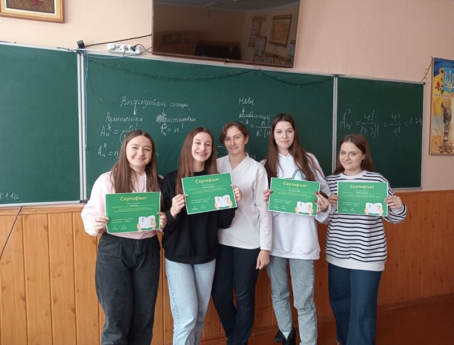 Дівчата: Вовк Ярина, Гармата Ангеліна, Харитонюк Софія та Чайка Анастасія презентували свій проект дизайну підручника “Підприємництво і фінансова грамотність” і за участь отримали електронний сертифікат учасника конкурсу від Центру фінансових знань “ТАЛАН”.