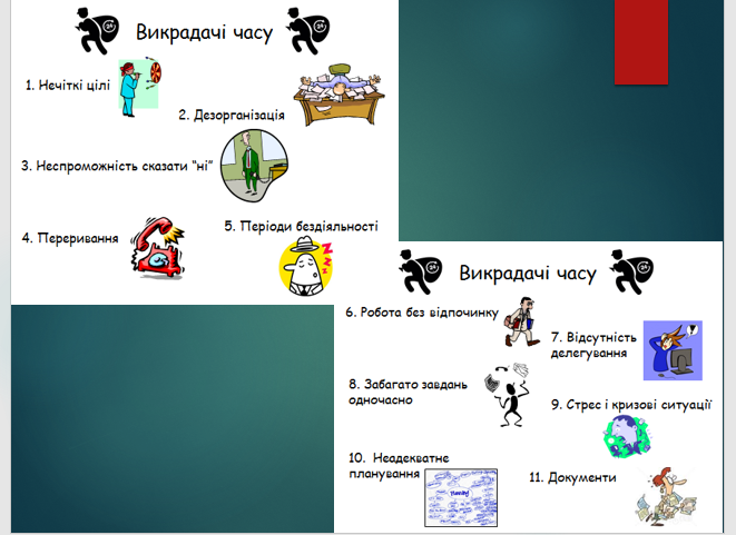 Довідка: «Тайм-менеджмент – це вміння так розподілити свій час, щоб не довелося працювати вечорами і по вихідних».