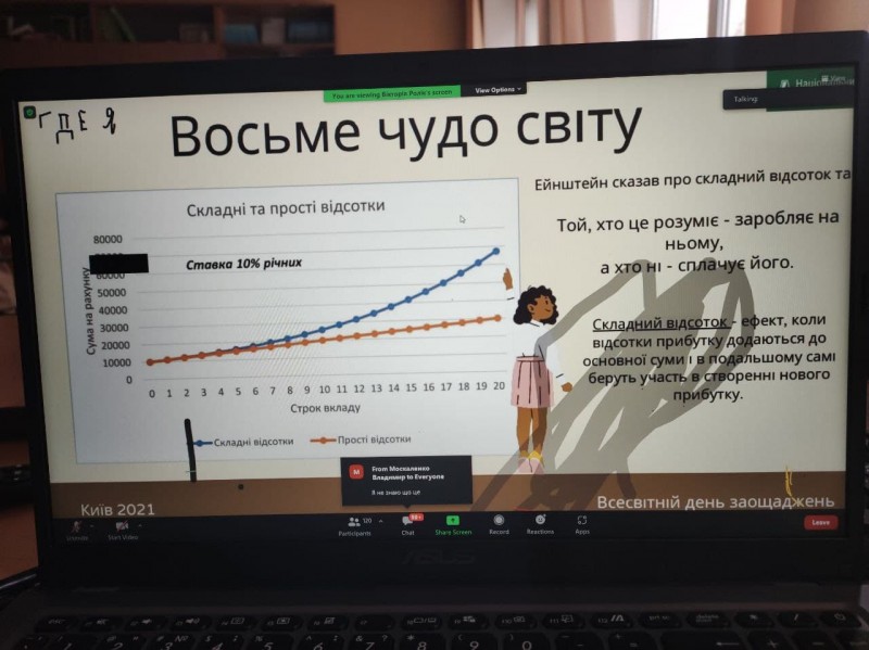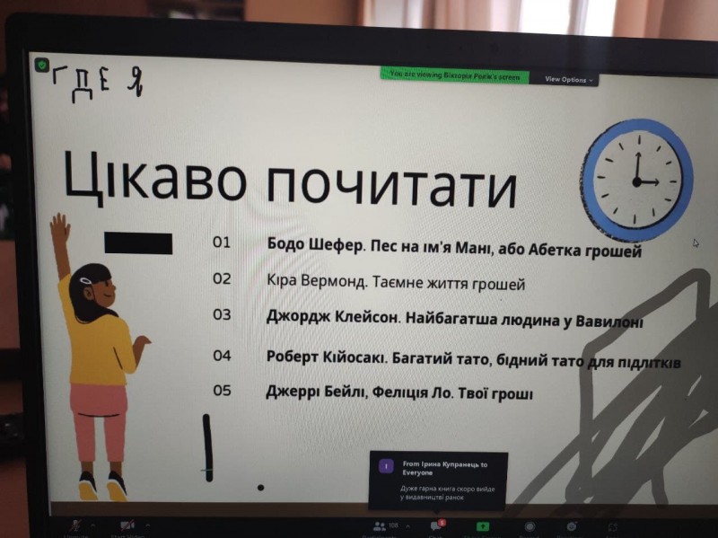 Учні 10 – А класу були учасниками вебінару «Як підлітку накопичити на мрію. Фінансові цілі та заощадження», який проводив Національний банк України. Учні дізналися, як перетворити свою мрію на фінансову ціль, якими ресурсами володіє кожна людина, познайомилися з матрицею ухвалення рішень Ейзенхауера, отримали рекомендації для заощаджень та дізналися «золоте правило» бюджету, а також, що Ейнштейн називав восьмим чудом світу, а також запропонували підбірку літератури на фінансову тематику.