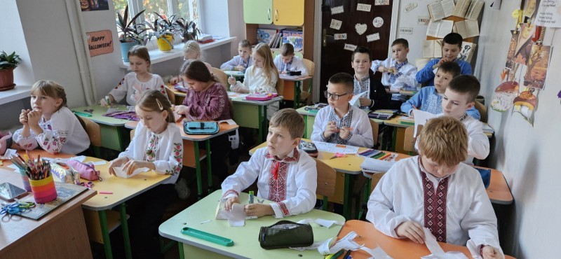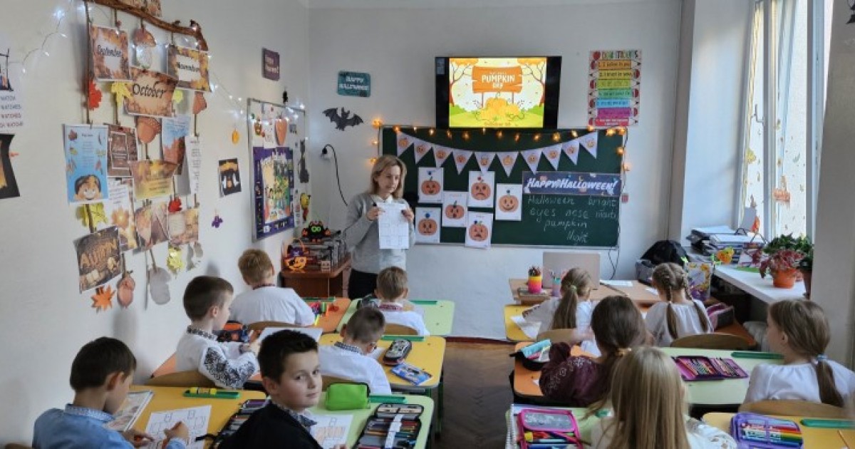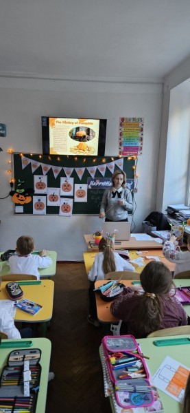 Перед початком уроку Роксолана Гевко підготувала клас. Аудиторія була прикрашена павутинням, гарбузами, паперовими привидами та кажунами, що створювало справжню атмосферу свята Хелловіну.