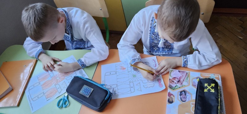 Цікавинкою уроку стало спільне виготовлення «гарбузових ліхтарів» із паперу. Роксолана Гевко роздала дітям шаблони гарбузів, фломастери, ножиці та кольоровий папір. Діти із захопленням створювали свої «світильники Джека», використовуючи яскраві кольори та проявляючи креативність. Це завдання допомогло розвинути творчі здібності та координацію.