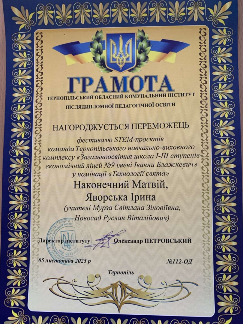 Щиро вітаємо талановиту команду творчих мейкерів з ПЕРЕМОГОЮ у фіналі обласного фестивалю STEM-проєктів у номінації «Технології свята»! Проєкт «Новорічне містечко» став справжнім символом креативності, інженерного мислення та командної роботи. Учні 11 класів Наконечний Матвій та Яворська Ірина майстерно представили й захистили цей проєкт на високому рівні! Наші юні мейкери (учні 8–11 класів) довели, що поєднання науки, техніки й творчості може створити справжню новорічну атмосферу та надихати на нові інженерні ідеї! Висловлюємо щиру подяку педагогам за натхнення, підтримку й професіоналізм: Новосаду Руслану Віталійовичу Мурзі Світлані Зіновіївні Захарчук Емілії Орестівні Абрамʼюк Аллі Якимівні Сіранту Віталію Теодозійовичу Будик Людмилі Ярославівні Ваша праця — запорука високих результатів і нових досягнень!