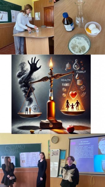 Людство з давніх-давен знало про шкідливі наслідки зловживання алкоголем і робило спроби поставити перешкоди на його шляху. Учні 9 А та 9 В класів брали участь у диспуті « Судимо алкоголь». Школярі спробували відповісти на запитання, від кого чи від чого залежить чи буде наша молодь здоровою від алкогольної залежності? Було наведено багато прикладів щодо негативного впливу міцних напоїв на усі органи людського організму. Також для учнів було проведено демонстраційний дослід «Денатурація білка». Дев’ятикласники наочно переконалися як етиловий спирт впливає на молекули білків, з яких побудований будь-який організм , та руйнує їх структуру. Школярі прийшли до висновку, що тільки тверезі люди, твереза нація може бути сильною, мудрою та успішною.