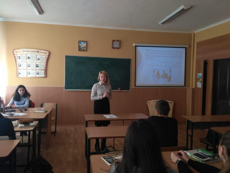 5 квітня 2019 року урок у 10-Б класі на тему: «Дохід від інвестицій на ринку фізичного капіталу. Дисконтування вартості доходу від інвестицій у бізнесовий проект» провела Письменна Тетяна Валеріївна, к.е.н., доцент кафедри фінансового менеджменту і страхування ТНЕУ. Для початку вона навела приклади найкращих ідей для бізнесу (вдома, пов’язаного з продуктами харчування, сферою послуг, інтернет-роботою, відкриттям курсів і т. д.). На прикладах пояснила учням такі поняття як «інфляція», «дисконтування», «прості і складні відсотки», розв’язали кілька задач. Під час уроку відбувався активний діалог між викладачем та учнями.