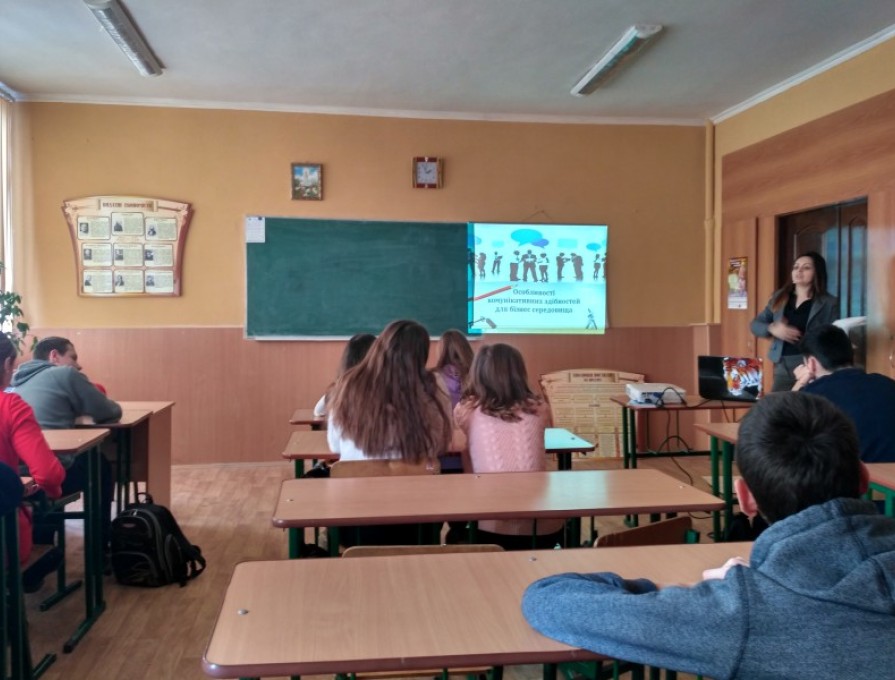 Сьогодні, 5 лютого 2018 року, відбулося перше заняття, яке провела к.е.н., доцент Котовська Ірина Василівна з кафедри менеджменту у виробничій сфері. Тема була особливо актуальна і потрібна для учнів 9-В класу, а саме «Особливості комунікативних здібностей для бізнес-середовища».
