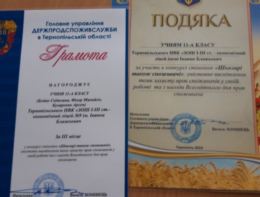 У березні 2019 року , до Всесвітнього дня захисту прав споживачів Держпродспоживслужба Тернопільщини оголосила конкурс на змістовне висвітлення теми захисту прав споживачів на стіннівці серед учнів 8-11 класів «Школярі також споживачі», у якому школярі нашого навчального закладу взяли активну участь.
