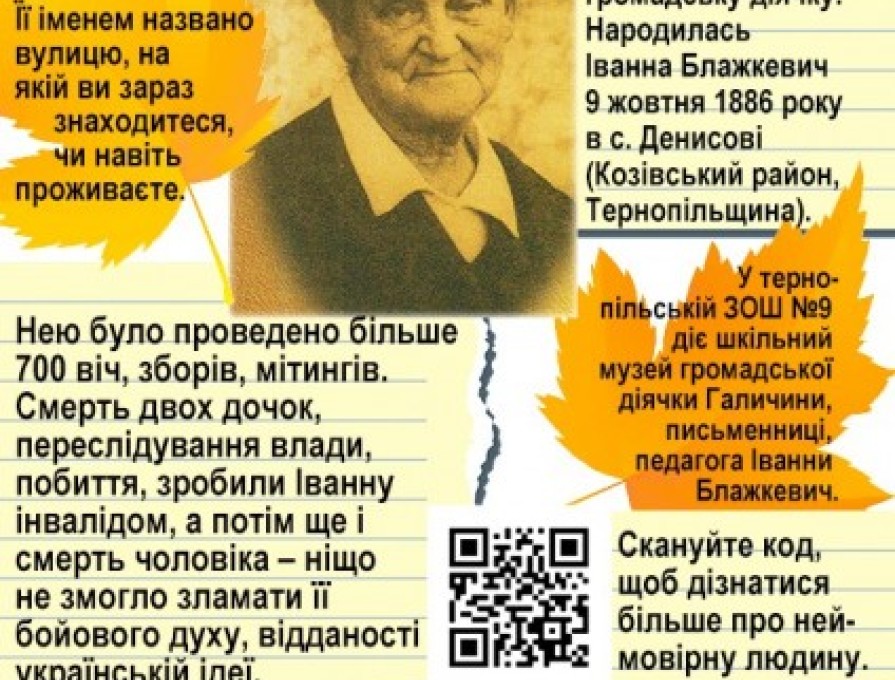 Ще у вересні учні 10-б класу разом із учителем української мови й літератури Іриною Човніцькою розпочали роботу над просвітницьким проєктом « Чи знаєте ви жінку, зображену на фото?» Усім відомо, що після вторгнення росії в нашу країну в місті Тернополі було перейменовано 13 вулиць, які мали російське походження. Однією серед таких є вулиця Макаренка, яку перейменовано на вулицю І.Блажкевич. Як з’ясувалось, деякі жителі цієї вулиці не знали нічого про цю постать. Тому ми вирішили попрацювати над даним прєктом, аби донести до мешканців інформацію. Нами було створено буклети з необхідними матеріалами, які учні розмістили на дошках оголошень будинків.