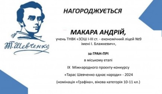 Макара Андрій, учень10-Б класу виборов в міському етапі Гран-прі IX Міжнародного...
