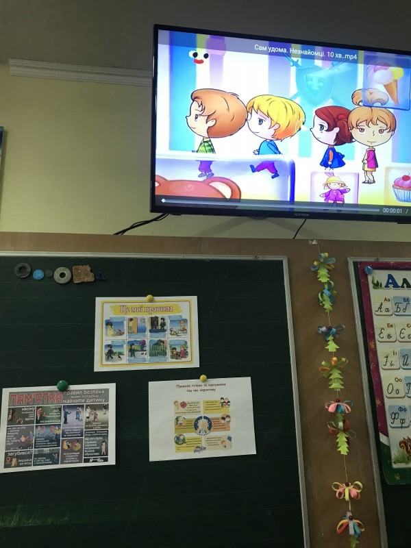 На перерві в холі школи-ліцею транслювались корисні мультфільми з телеканалу ПЛЮСПЛЮС про те, як дбати про власну безпеку, коли залишились самі вдома, як спілкуватись з незнайомцями та як діяти, щоб не потрапити в неприємні ситуації.