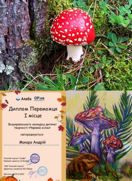Завершився Всеукраїнський дистанційний конкурс дитячої творчості «Чарівна осінь». Команда Алаба запросила юних митців з усієї України поділитись своїм баченням . Макара Андрій , учень 9-Б класу заняв 1 місце із своєю роботою.