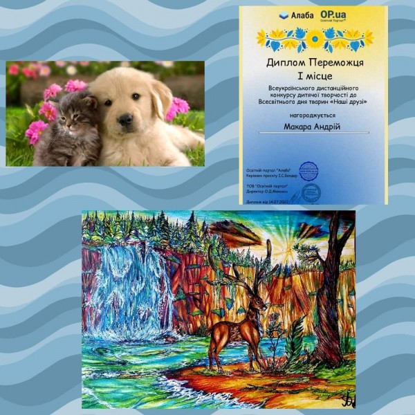 Завершився Всеукраїнський дистанційний конкурс дитячої творчості До Всесвітнього дня тварин «Наші друзі». Команда «Алаба»(ТОВ "Освітній портал" (проєкт Алаба) став переможцем конкурсу-огляду електронних освітніх ресурсів для закладів загальної середньої освіти ) запросила юних митців з усієї України поділитись своїм баченням ролі тварин у нашому житті, а також проблемою захисту їхніх прав. Макара Андрій , учень 9-Б класу заняв 1 місце із своєю роботою.