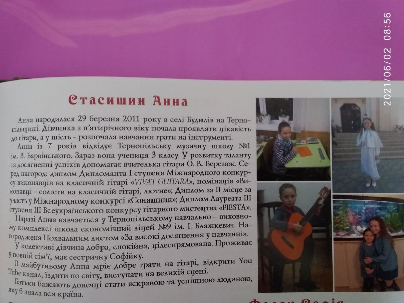 Нещодавно у місті Тернополі відбулась презентація книжки «Майбутнє Тернопільщини-талановиті діти». Це 10 видання Всеукраїнського поєкту «Майбутнє України-талановиті діти». Дуже приємно, що в книгу увійшов матеріал про Стасишин Анну, ученицю 3-Б класу , яка з шестирічного віку розпочала навчання у Тернопільській музичній школі №1 по класу гітари. Дівчинка надзвичайно талановита , вже має багато досягнень на Міжнародних та Всеукраїнських конкурсах у номінації «Виконавці-солісти на класичній гітарі,лютні».