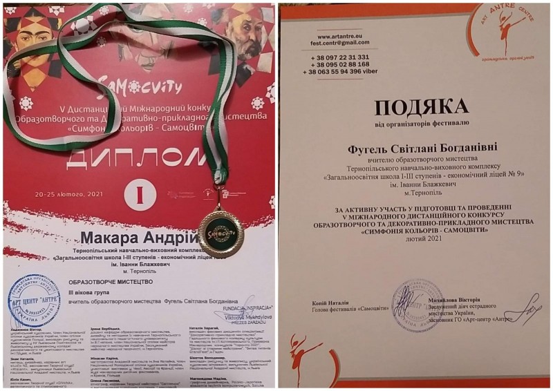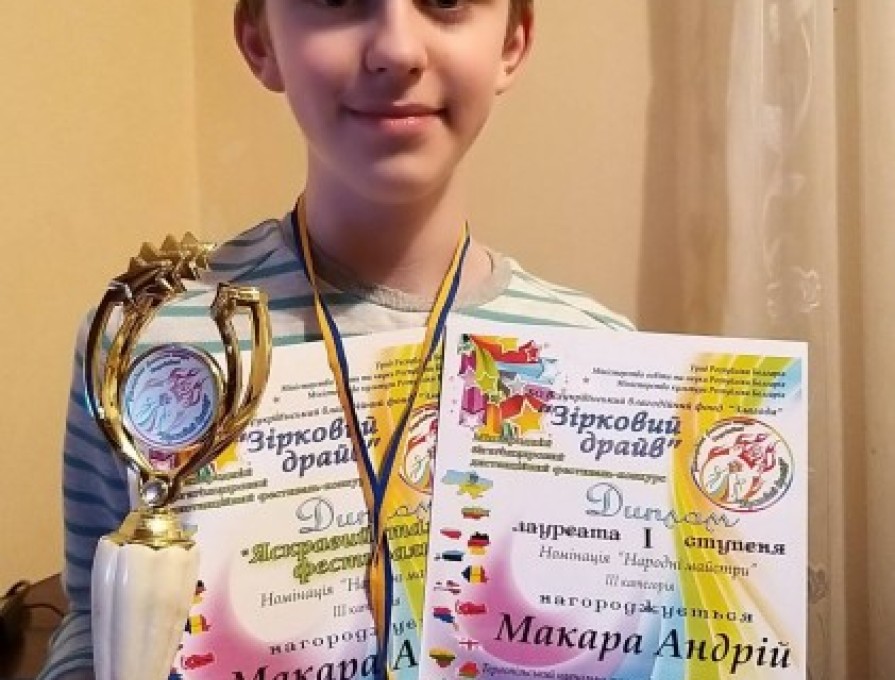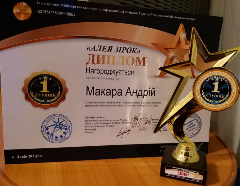 1.У міжнародному багатожанровому дистанційному фестивалі-конкурсі "Зірковий драйф", у номінації народні майстри. Був нагороджений дипломом лауреата I ступеня, дипломом "Яскравий талант фестивалю" та кубком, а також подякою була нагороджена вчитель ТНВК ШЕЛ №9 ім.І.Блажкевич Фугель Світлана Богданівна.