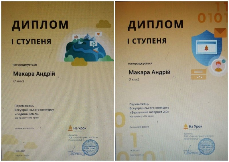А також був нагороджений дипломами I ступеня з Всеукраїнських конкурсів "Безпечний інтернет 2.0" та "Година Землі" від проекту "На Урок"