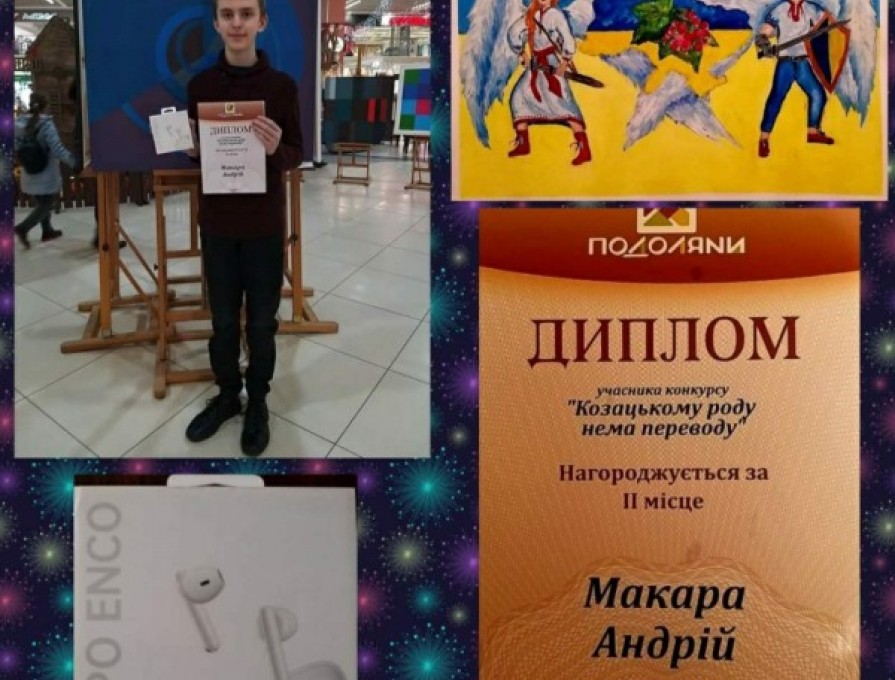 Макара Андрій, учень 8-Б класу прийняв участь у конкурсі "Козацькому роду нема переводу " організованим ТРЦ Подоляни м.Тернопіль , зайняв 2 місце . Був нагороджений дипломом та подарунком.