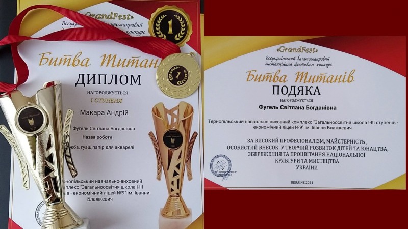 2. У фестивалі-конкурсі "Битва Титанів".Був нагороджений дипломом I ступеня та медаллю, а також подякою була нагороджена вчитель ТНВК ШЕЛ №9 ім.І.Блажкевич Фугель Світлана Богданівна.