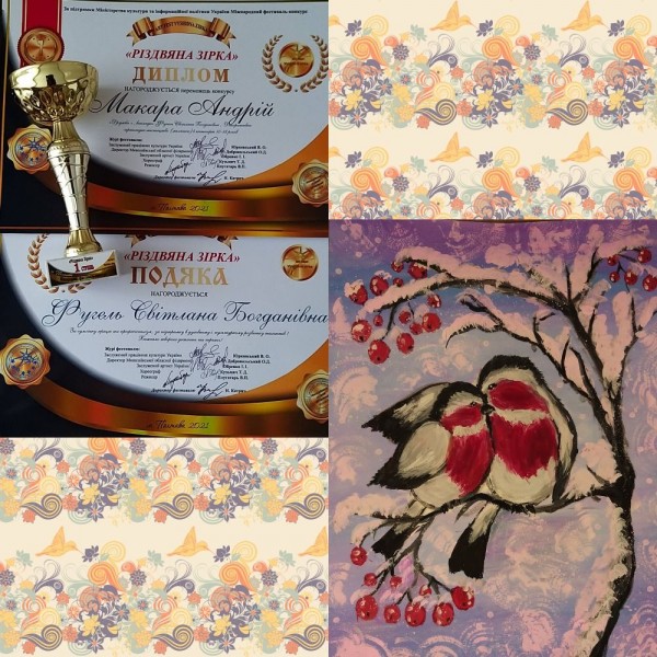 1.У міжнародному багатожанровому дистанційному фестивалі-конкурсі "Різдвяна зірка", у номінації народні майстри. Був нагороджений дипломом лауреата I ступеня та кубком, а також подякою була нагороджена вчитель ТНВК ШЕЛ №9 ім.І.Блажкевич Фугель Світлана Богданівна.
