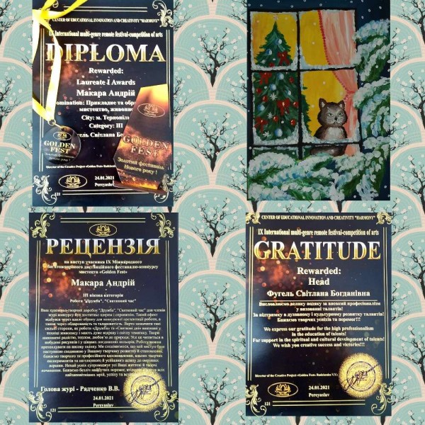 3. У IX міжнародному багатожанровому дистанційному фестивалі-конкурсі мистецтв "Golden Fest". Був нагороджений дипломом I ступеня, медаллю та рецензією, а також подякою була нагороджена вчитель ТНВК ШЕЛ №9 ім.І.Блажкевич Фугель Світлана Богданівна.