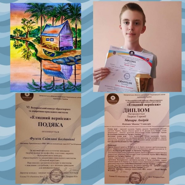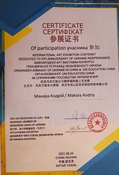 Макара Андрій, учень 8-Б класу прийняв участь у віртуальному ІІ Міжнародному конкурсі-виставки художніх робіт «День Незалежності України», організованої освітньою компанією Uni Education» за сприяння Посольства України в Китаї.