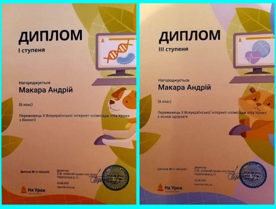 Макара Андрій, учень 8-Б класу взяв участь у X Всеукраїнській інтернет-олімпіаді "На урок" з біології та основ здоров'я. Був нагороджений дипломами I та III ступенів.