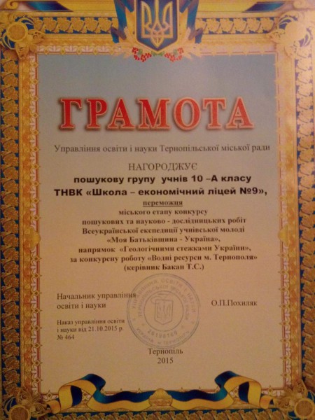 Жюрі міського етапу конкурсу високо оцінило роботу нашої пошукової групи під керівництвом Бакан Т.С., присудивши їй І-ше місце, а Управління освіти і науки Тернопільської міської ради вручило переможцю грамоту.