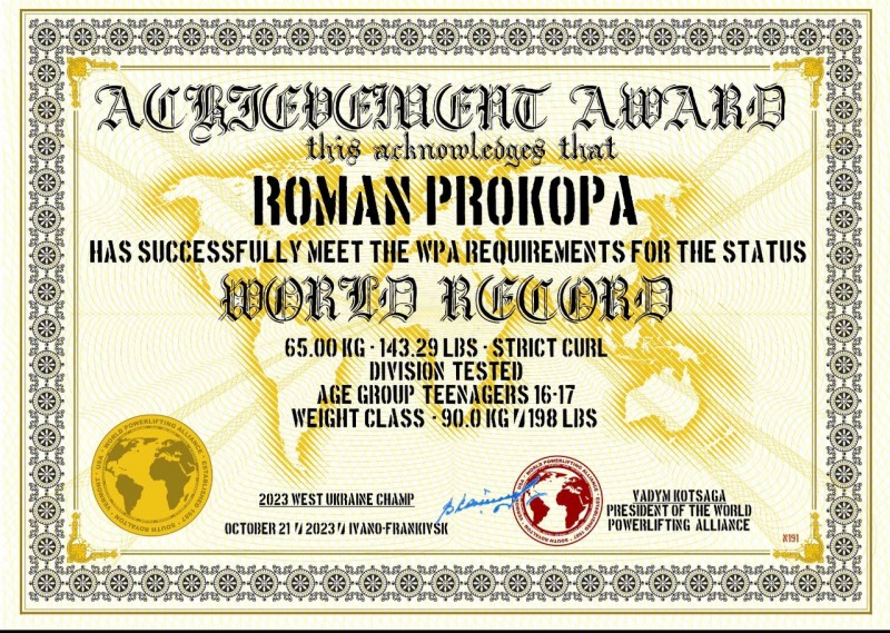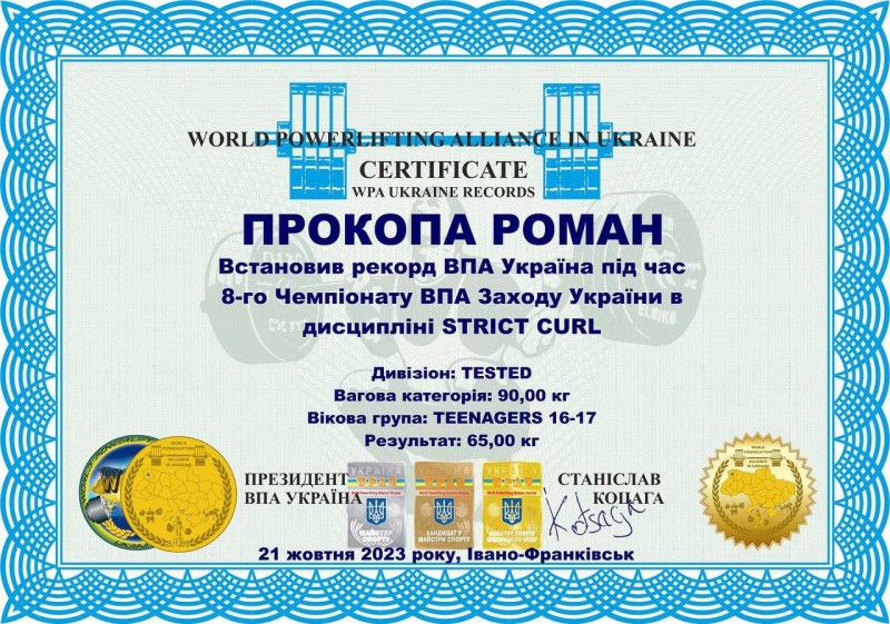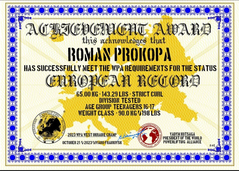 21 жовтня в Івано-Франківську відбувся Відкритий чемпіонат ВПА Заходу України із окремих дисциплін пауерліфтингу та силових видів. У цих міжнародних змаганнях Роман Прокопа посів І місце у ваговій категорії до 90 кг та віковій категорії teenagers 16-17 р., піднявши штангу, вага якої 65 кг, та у жимі лежачи, піднявши 115 кг і здобувши рекорд світу та Європи.