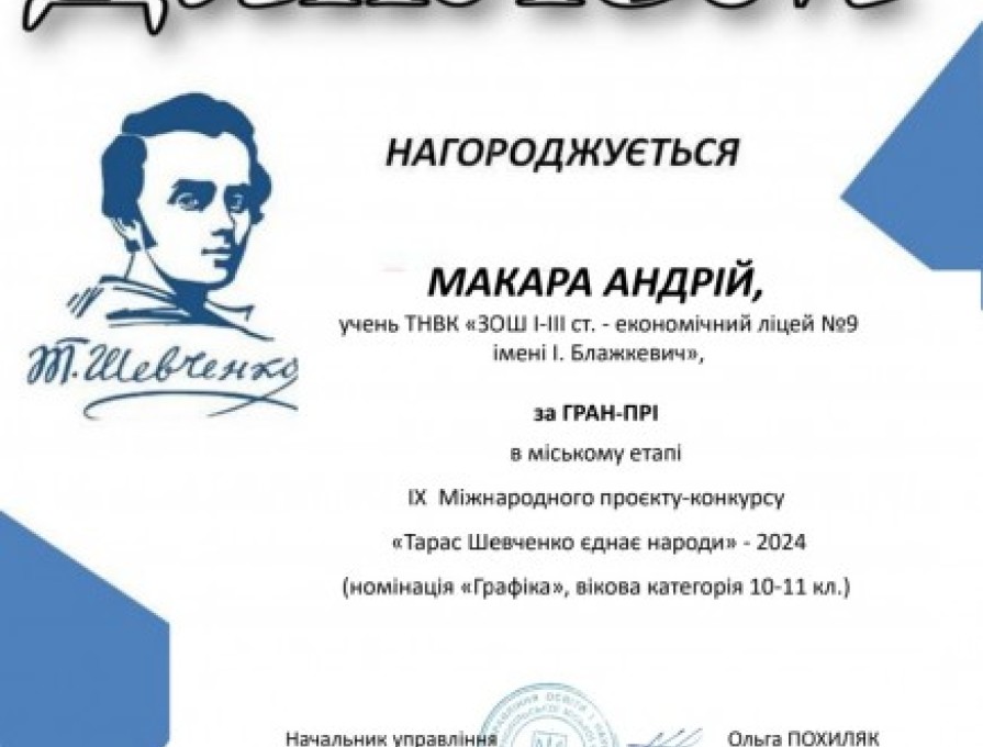 Макара Андрій, учень10-Б класу виборов в міському етапі Гран-прі IX Міжнародного проєкту-конкурсу " Тарас Шевченко єднає народи"-2024 ( номінація "Графіка", вікова категорія 10-11кл.)