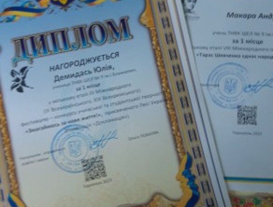 У номінації «Мій Шевченко» дипломом управління освіти Тернопільської міської ради за 1місце нагороджений учень 9-Б класу Макара Андрій, керівник Світлана Фугель подякою управління освіти Тернопільської міської ради «За оригінальну передачу засобами образотворчого мистецтва змісту літературного твору» нагороджена учениця 4-А класу Пивоварчук Наталія, керівник Наталія Гречанник.