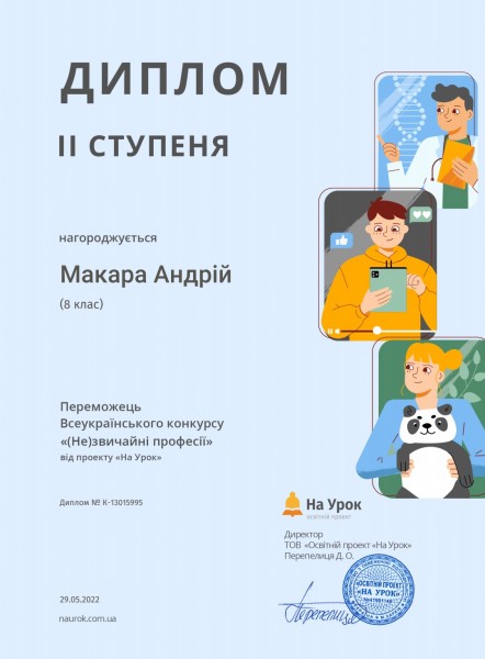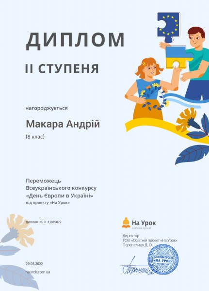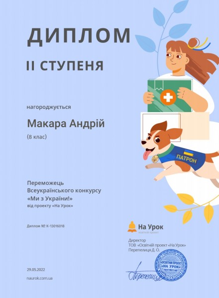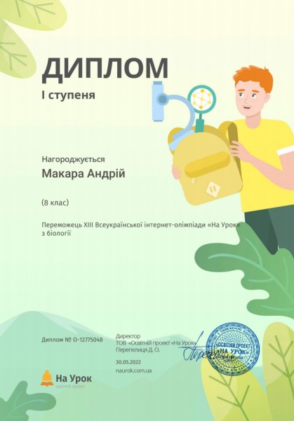Макара Андрій, учень 8-Б класу прийняв участь у весняних онлайн- олімпіадах з біології та зарубіжної літератури, а також конкурсах від освітнього проекту "На урок". Був нагороджений дипломами.