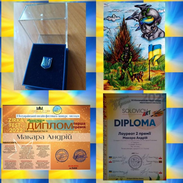 Макара Андрій, учень 9-Б класу взяв участь у 2 онлайн- конкурсах з образотворчого мистецтва. Був нагороджений дипломами I та II преміями, кубком та значком - герб України.