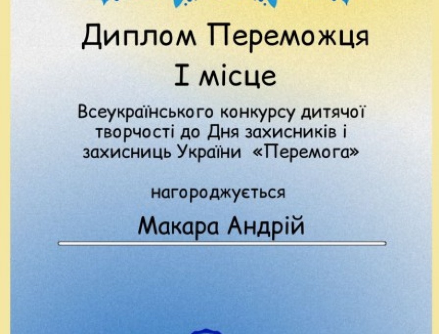 Всеукраїнський дистанційний конкурс дитячої творчості До Дня захисників і захисниць України «Перемога». Макара Андрій , учень 9-Б класу заняв 1 місце із своєю роботою.